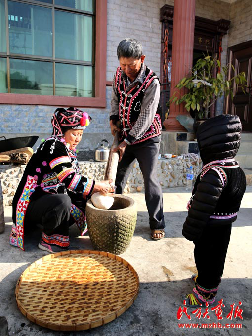 张俊波父母一起舂粑粑,准备正月初三拜年用