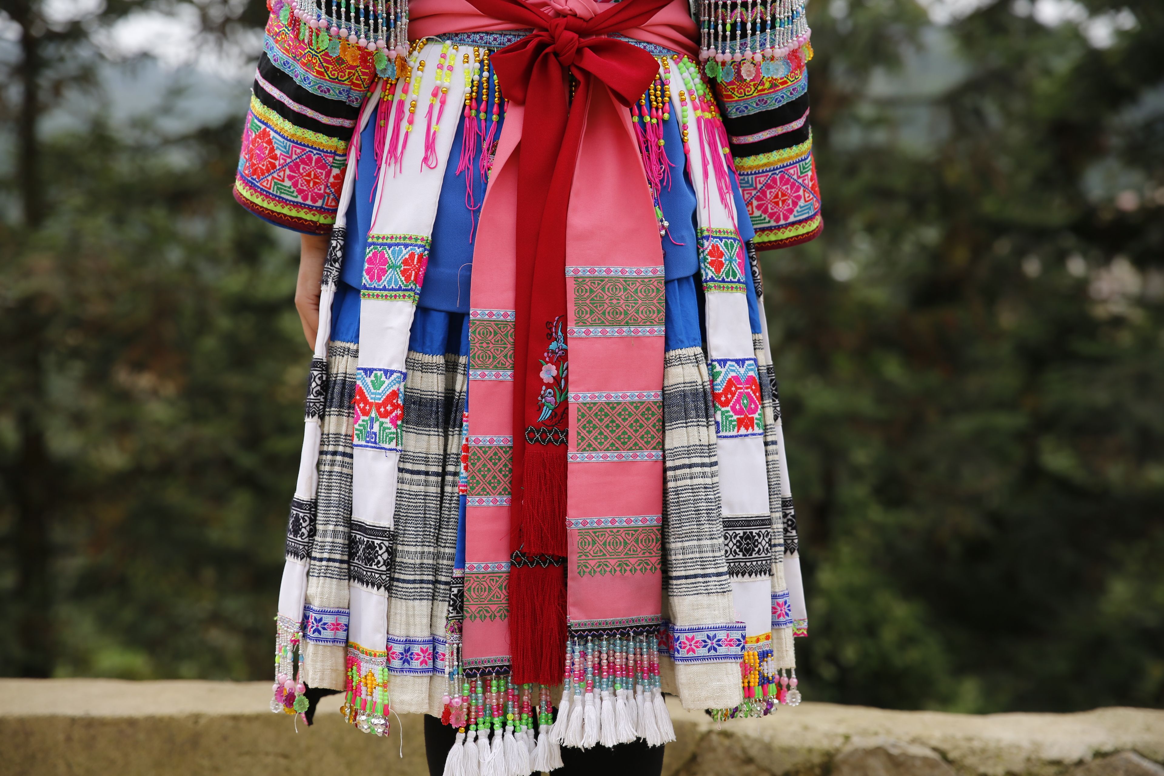 苗族女子服饰花带百褶裙-裙摆侧面绣花及印染