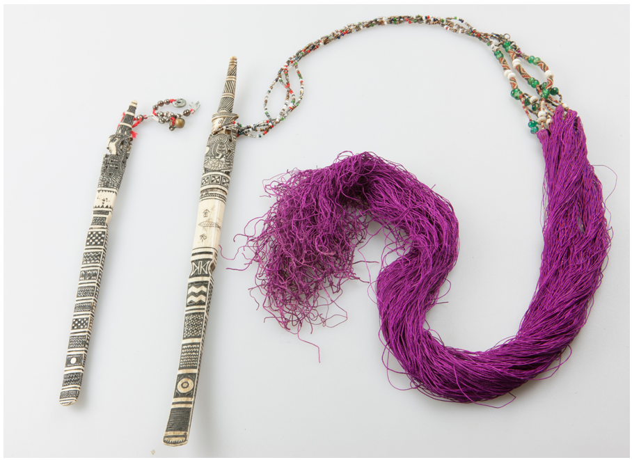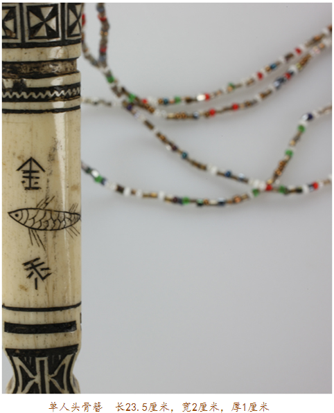 骨簪头部以下是充满几何感的水波纹、山形纹、米字纹、圆形纹,留白之处有鱼纹、花纹以及少许文字。文字或是雕刻者本人,或是其心爱之人。一般头像处或中部系有几束彩色料珠的红缨穗饰物用以盘绕发髻上,或是以银铃、银片来装饰。