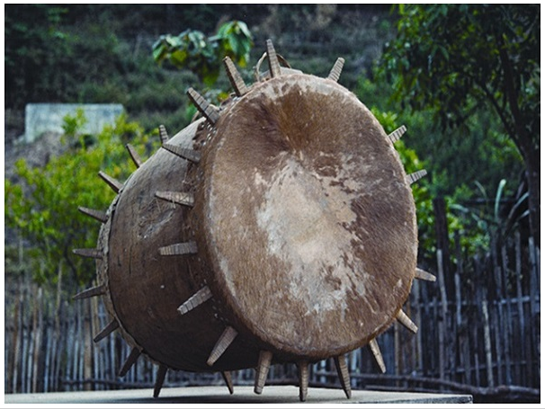 民族文化宫博物馆藏基诺族木质皮鼓,鼓面直径55厘米,高88厘米,长约130厘米,20世纪八十年代征集于云南省西双版纳州景洪县基诺乡。鼓身为木质,呈圆柱形,两端对称。鼓有两面,用牛皮蒙制。两端鼓面边缘各环绕嵌有花纹的上方下锥形的木棍(一侧17根,另一侧为20根),木棍长15厘米。鼓身两侧有方形孔,为鼓的音孔,上部有两个把手,用于系绳悬挂木鼓。因鼓面两端边沿嵌有数十根鼓钉,形似太阳放射出的光芒,也称为“太阳鼓”。