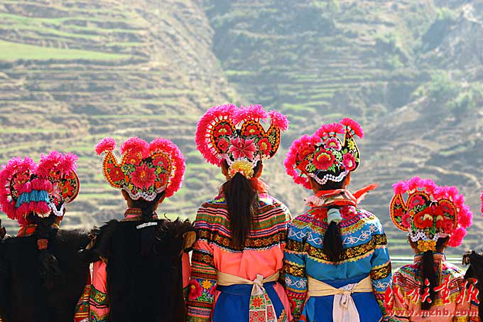 彝族姑娘们头上戴着绣有马缨花图案的传统鸡冠帽
