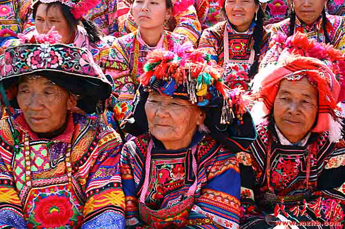彝族女子不分老少,服装上都绣满花卉,鲜艳夺目