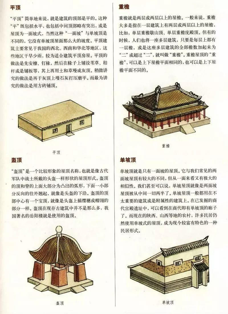 其中庑殿顶最早,约出现于先秦时期。在商代的甲骨文、周代铜器、汉画像石与明器、北朝石窟中都有反映。据《周礼·考工记》载:“商人四阿重屋”,即早在商朝,已有四阿屋顶,但只是四坡水的茅草房而已。