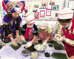 广西南宁市南师附小把民族团结教育融入日常教学中。图为老师和同学们一起制作传统美食。丛蓉摄