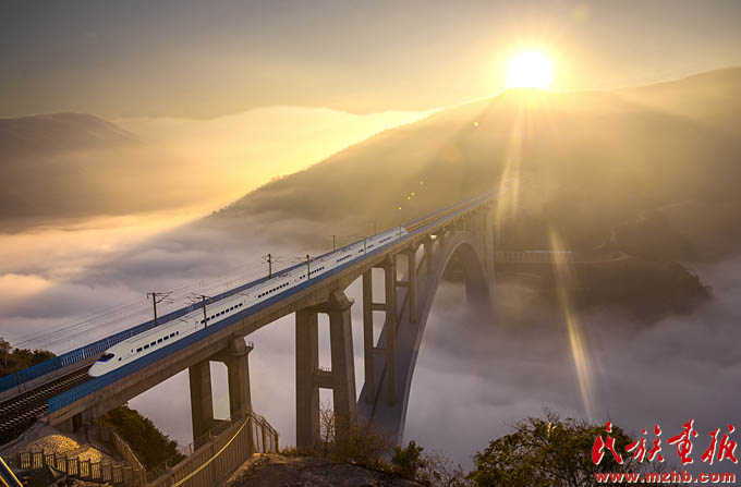 改革开放40年来,少数民族和民族地区成为改革开放的切实受益者,2017年1月1日,沪昆高铁线上的列车沐浴着新年的阳光飞驰在云贵高原上(史家明 摄影)