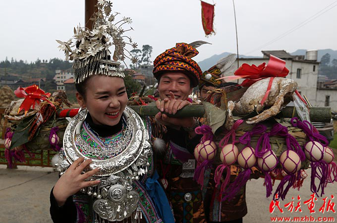 村民挑着当地特有的糯米和酸鱼酸肉,为客人送行(江桥生 摄影)