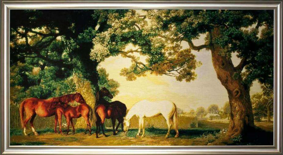 一般画面较大,多数复制名画、人物和风景照片。用线颜色往往达数百种,特别强调色阶、色相的过渡,并注重人物神态的刻画。作品常作为大型建筑的室内装饰。