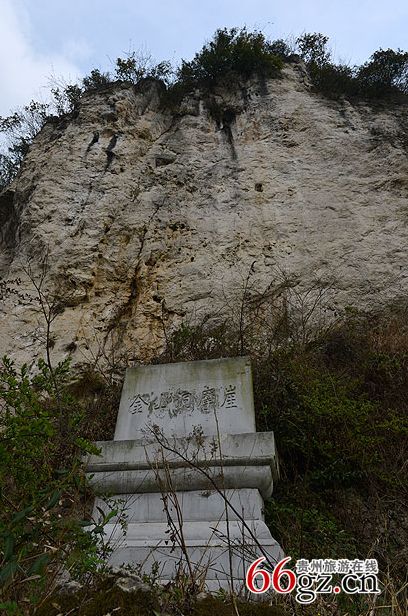 金山洞摩崖是贵阳市花溪区最早的摩崖石刻,也是贵州最早的摩崖石刻之一。该摩崖石刻位于燕楼乡东北三里的金山洞岩壁上。其山上丰下俭,古人利用自然山形,在可避风雨的洞壁上摩岩、题刻赋诗作画。整个摩崖面积通高140厘米,宽74厘米;自右至左竖行排列,共6行82字。据系楷书阴刻,书法古朴流畅,具有较高的历史价值。
