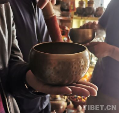 一位店主告诉我,sing bowl在印度和尼泊尔都有,但印度的一般稍大些,尼泊尔的稍小些。我仔细对比了店中的两种碗,确实如此。同时,有些碗内部有纹饰,外部也有相应简易图形的点缀,比如圆形斑点,但有些碗的内壁和外壁无任何纹饰。一般有纹饰的价格要稍高一些,价格从200元至350元不等。但分辨sing bowl质量最重要的是看其“唱歌”的音质与在手上产生震动的幅度,一般以音质低沉雄厚为佳,以震动引发全身共鸣的程度高为好。但我们的现场演示表明,个人使用的技巧也很重要。