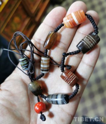 在藏语中,天珠被称为“瑟”。在普兰边贸市场中,并不是所有的商家都有天珠。但凡是有上好天珠的商家,必有很大的吸引力。在市场中,他们也充满自信。我在市场中走访了多家有天珠的商店,并简要总结了多数商家对天珠的认定标准。在尼泊尔商家的眼中,天珠的质量要看几个方面。一是“石头”的质量,上好的“石质”是好天珠的必要条件。他们在检验时,多用门牙上下撞击天珠的不同位置,便可以分辨出天珠料子的好坏。在那里,我也遇到了几位买天珠的僧人,其辨别过程中也使用了这样的方法。二是包浆程度,一颗好天珠就要有相应的岁月的痕迹,而包浆就是岁月长短的最重要的代表。当然,这也并非绝对,因为包浆的形成主要依靠人为的把玩,那些没有相应包浆但达到上千年的天珠在他们眼中依然很快便会被识别出。在尼泊尔的茶馆中,一位当地的藏族群众向我介绍了一颗天珠,据说有人曾用成都的一套房子来换,但并未打动主人,那颗珠子摆在我的面前,没有所谓的包浆,但岁月形成的厚重感却十分明显。三是天珠的孔道,因为孔道也是岁月的见证者,一般孔道越是圆润便越具有价值。