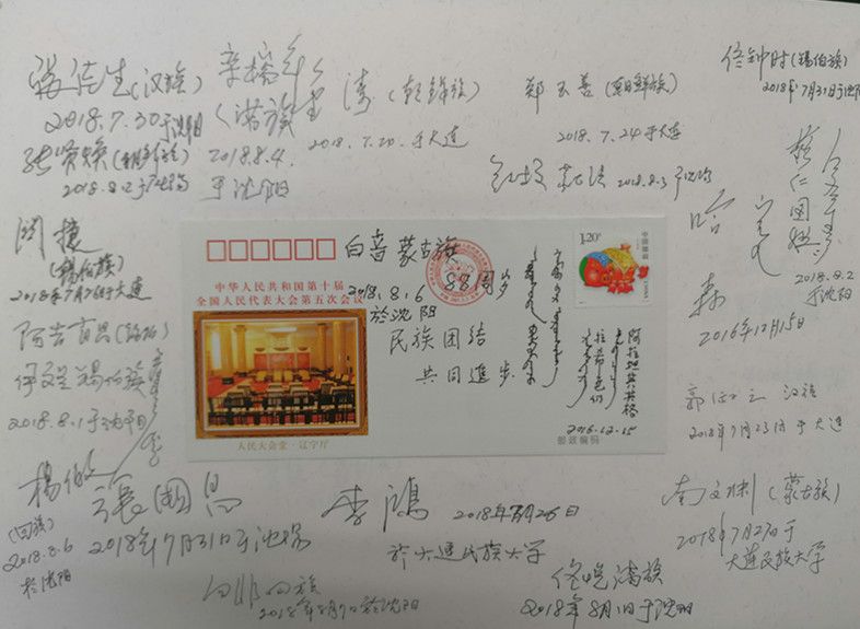在采集口述影像录音资料的同时,项目组还收集了大量的珍贵历史照片以及相关文物。值得一提的是,他们设计了一种非常有特色的受访者签名簿,中间贴着绘有56个民族的音乐舞蹈图案的首日封或明信片,四周签上受访者的人名签名字、民族特征,有些还用民族文字书写,体现了中华各民族团结在一起的精神风貌。签名簿有厚厚的几大本,设计精美,承载着民族工作口述史资源采集的经历,具有丰富的文化内涵和博物馆收藏价值。
