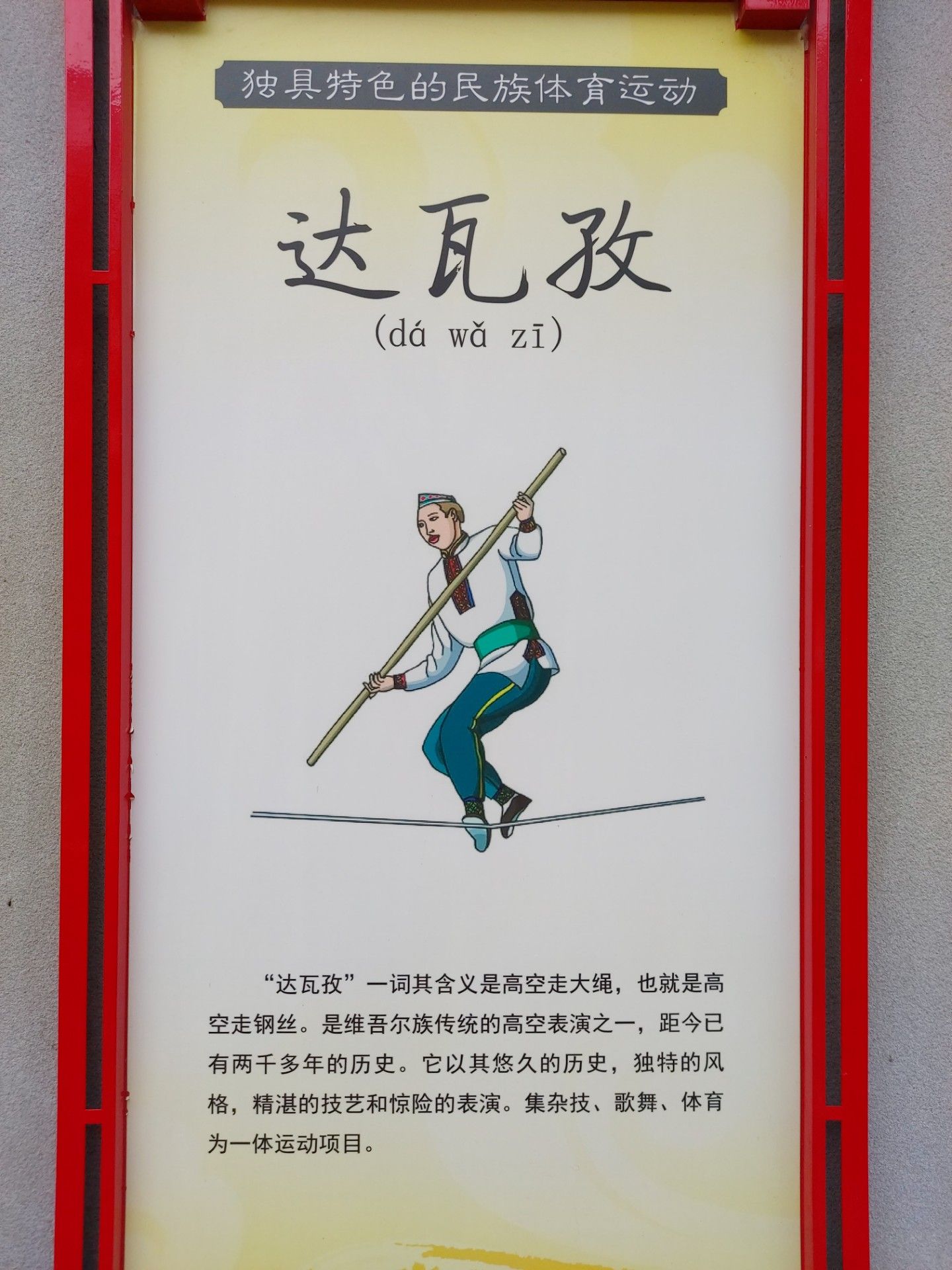“达瓦孜”一词其含义是高空走大绳,也就是高空走钢丝。是维吾尔族传统的高空表演之一,距今已有两千多年的历史。它以其悠久的历史,独特的风格,精湛的技艺和惊险的表演。集杂技、歌舞、体育为一体运动项目。
