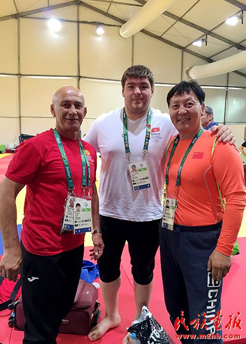 2016年,里约奥运会期间,乌日根桑格(左)与中国国家柔道队队员于颂(中)、国家柔道队原主教练程志山合影留念。