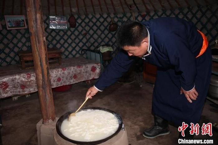 图为多年前,贷庆在蒙古包里制作传统奶食品。 受访者供图