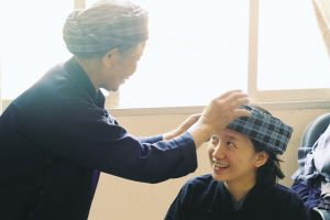 黄奶奶帮我穿戴布依族的服饰。