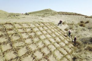 在甘肃省古浪县北部沙区旱麻岗治沙点,八步沙林场治沙人和群众一起扎草方格压沙。 新华社记者 范培珅摄