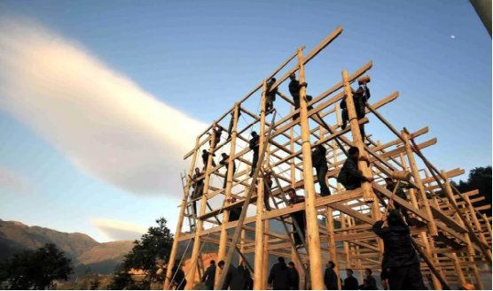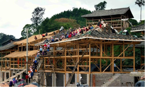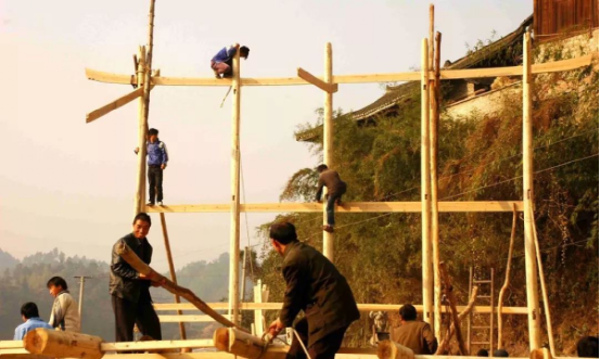 苗寨吊脚楼的修建程序有很多步,有选择屋基→备料→发墨→拆枋凿眼→穿排→立房→盖瓦→装扮等多道工艺流程。