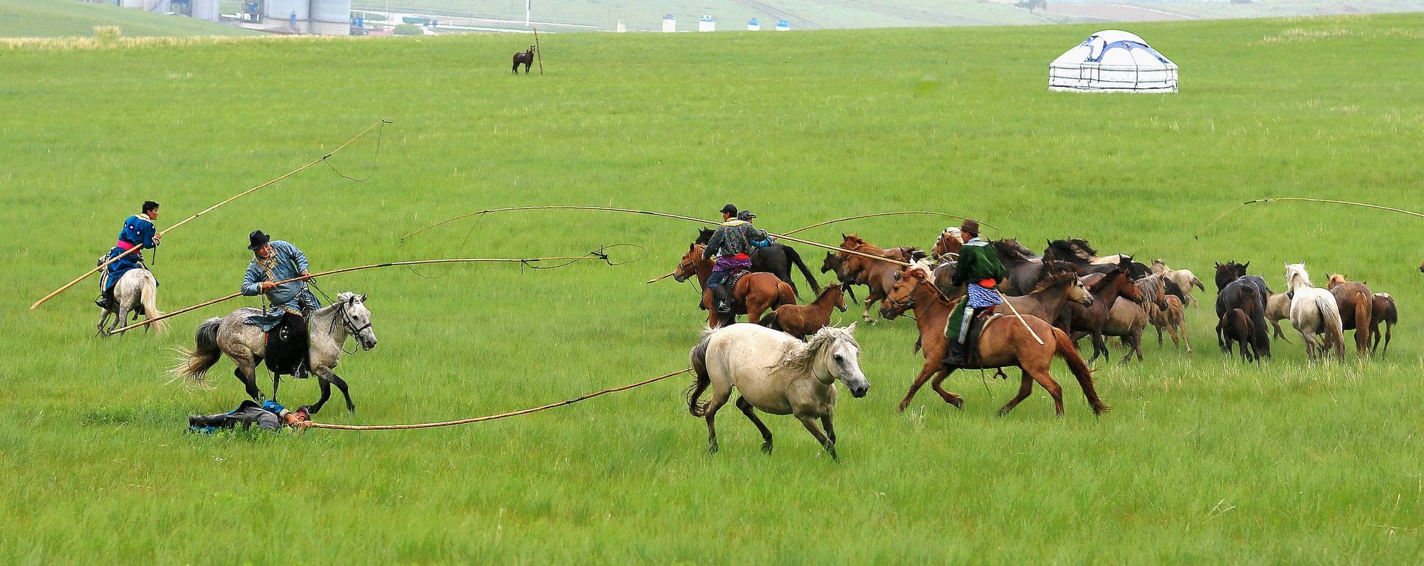 绳索套马是蒙古族的传统体育活动。原为牧民放牧时约束马匹的一种手段。比赛时,选一烈性难驯的马,先令其疾驰。参赛的成群骑手,手持打有活结的绳索,骑马紧追,到一定距离,抛出绳索套马,以先套准并能束住烈马者为胜。