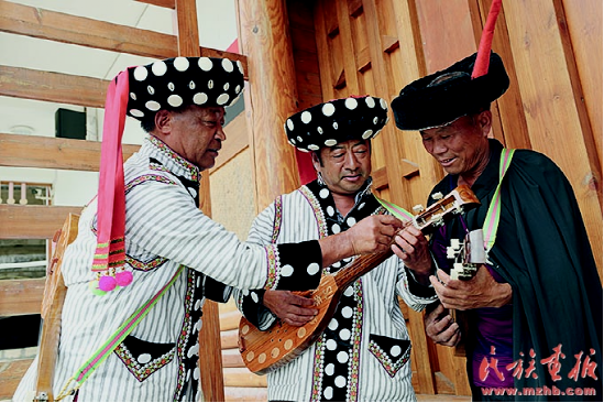 国家级非物质文化遗产“傈僳族民歌”传承人李学华(左一)传授技艺。