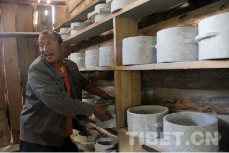 村主任扎巴在整理货架上的待售石锅 田春艳 摄