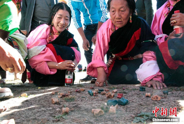 图为青海省玉树藏族自治州民众玩贴改(骨节)来庆祝“沐浴节”的到来。来源:中新社 摄影:孙睿