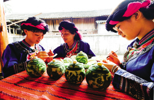 在贵州省天柱县地湖乡永光村,苗族姑娘们聚在一起学习蜜饯雕刻技术,争当技艺传承人。