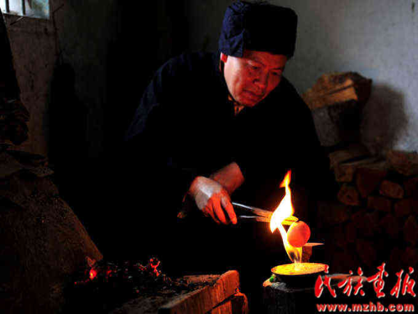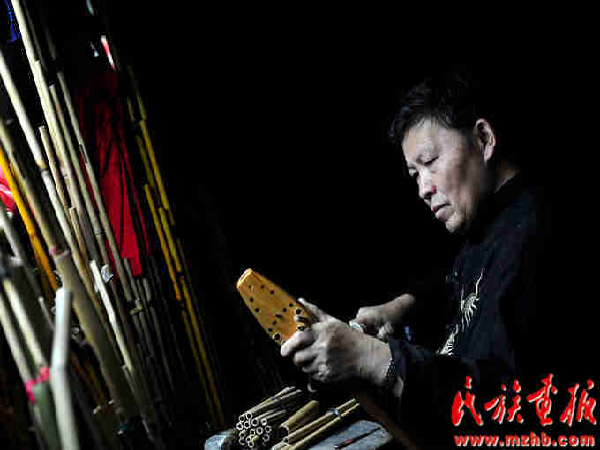 莫师傅在对两个芦笙进行高低音的和谐调试