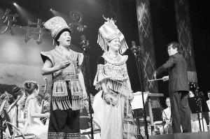 广西戏剧院成立一年来,承担起壮剧、桂剧、彩调剧3个国家级非物质文化遗产剧目和京剧国粹艺术的传承、保护、发展重任,不断推出具有“美丽广西、壮乡风格、时代特征、和谐兼容”的舞台艺术精品,此次推出的《壮族诗情》便是其中之一。《壮族诗情》共分“地鼓”、“天歌”、“水秀”、“山雄”4个章节,以150多名演职员的演出阵容,通过合唱、独唱以及民族器乐演奏的形式,如诗如画地描述了广西壮族的风土人情,突出了“美丽广西”时代主旋律。图为《壮族诗情》演出现场。