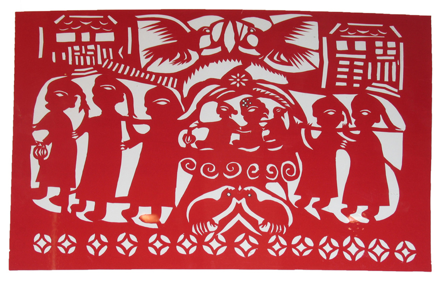 其实,这样一种民间工艺,早在清代,就已堂而皇之地登上了朝廷大雅之堂。如皇帝举行婚礼作洞房的神宁宫,墙壁就按满族习俗裱纸,四角贴着双喜字剪纸角花,顶棚中心贴着龙凤团花剪纸。在宫殿两旁的过道壁上也贴有角花。据说有人用纸剪成有鹿、鹤、松的“六合春”图案,加以彩绘,贴于朝服觐见慈禧太后,连她都以为是绣出来的。