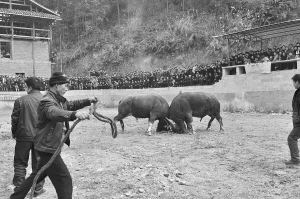 2014年1月2日,贵州省榕江县仁里水族乡仁吉侗寨群众开展斗牛活动,欢庆一年一度的侗年。