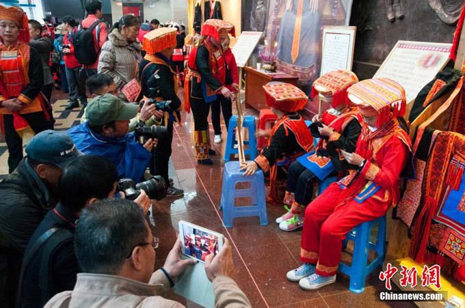 12月6日,在中国瑶族之乡广西金秀瑶族自治县的盘王节上,当地瑶族百姓展示瑶族织绣