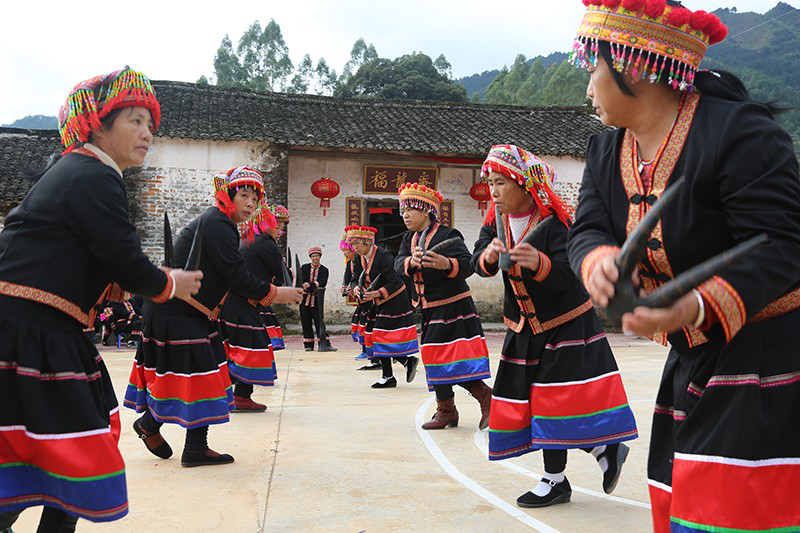 听罢门唻歌,再赏羊角长鼓舞。转鼓、跨步、收腿、回腰、碰角……这套由多人合作的舞蹈,动作粗犷,节奏明快,舞者配合默契,音韵铿锵。今年66岁的老艺人盘福贵,舞起祖宗留下来的已有一百多年历史的羊皮长鼓,身手矫健、动作敏捷,让人惊叹不已。盘福贵的爷爷、父亲都是跳羊角长鼓舞的高手,父亲把这项技艺传授给他,如今他又收女儿和孙子为徒,已是五代传承了。