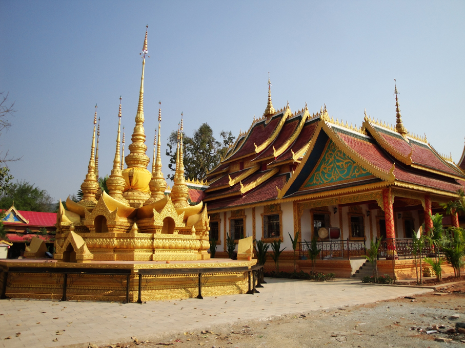 佛寺建筑是信仰小乘佛教的傣族地区建筑的一大特色,以落地重檐多坡面平瓦建筑为主。由大殿、僧舍和鼓房组成,中心佛寺外加一座戒堂、一座藏经楼、一座佛塔。主殿外观一般是单檐或重檐歇山式屋顶,或悬山式顶、多角或亚字形重檐歇山式顶。坡面进行一至二次跌落后有两层或上中下三层的单面坡或三面坡、五面坡,坡面的多少和佛寺的级别有关。屋面按纵向分为两段式或三段式或五段式,以中间最高,使庞大威严的屋面呈现出优美起伏的曲线。
