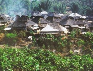 云南西双版纳傣族村落。傣族的典型村寨主要在西双版纳傣族自治州和德宏傣族景颇族自治州的平原上,但形制不同。西双版纳的传统住房以“凤凰展翅”的竹楼著称,就是人们常说的干栏式建筑。由于竹材易遭白蚁,翻建频繁,上世纪70年代已陆续改用竹木结构,屋顶覆缅瓦。即木料做房架结构,采用卯榫结合,竹材用于檩、椽、楼面、挡墙、栏杆等。