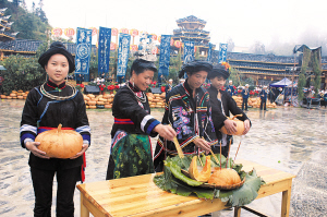 2012年10月28日,贵州省雷山县达地水族乡举行“走进水乡达地,体验水乡风情”建乡20周年庆典暨水族“瓜年”活动。“瓜年”上,5000个大黄南瓜特别引人注目。大南瓜营造了浓浓的乡情与年味,引得众多参加节庆的乡亲、游客纷纷留影纪念。