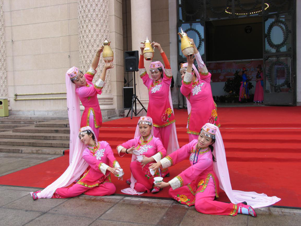 哲兹白:东乡族穆夫提教派中流传着一种历史悠久的舞蹈叫“哲兹白”,这种舞蹈多在宗教仪式中表演,舞者均为男子,动作以诵经的节奏为准。主要动作为:双手前后甩动两下,同时脚下动两步,然后双手在胸前交替拍胸,这时一腿稍弯曲,另一腿向前伸出。舞蹈特点诙谐、幽默、洒脱。