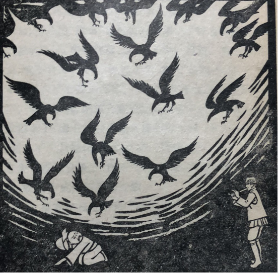 家家户户都要杀鹰做笛的事惊动了兀鹰。它们以为主人变心了,都惊叫着向高山深处飞去。从此,鹰就住在偏僻的山岩里,再不回来了。奴隶主再不害怕鹰笛了,又重新抢走了人们的牛羊骆驼,人们这时才知道上了奴隶主的当。