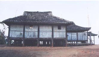 比较典型而普遍的是以德宏地区一户一院式的正方形冠盖式竹楼。构架为穿斗式木梁柱,楼面、隔间均用竹片或木板铺设。这种竹楼分主楼和附房两部分。上下两层,有主副两座楼梯。主楼呈正方形,楼上住人,分为卧室和客厅,供全家人起居、会客和存放粮食、杂物之用;楼下圈养牲畜。附房多建在主楼的一侧,用作堆放柴草及安置舂米的脚碓。