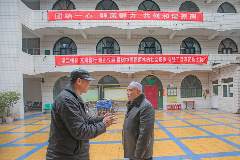 武把子本名何军杰,是回民街的“草根名人”,人人都叫他“武把子”,倒忘了他的本名。武把子性格憨厚耿直,幽默风趣。我们的车子一路开过回民街,跟他寒暄打招呼的人一路不断。武把子家祖上一直就在回民街,这里是他们家族世代赖以生存的根。从父母弟妹到儿子儿媳,他们一家三代都在回民街开店铺。虽然他在黄金地段的高楼买了大三居商品房,坐在宽敞的客厅就能看到当年西安的著名建筑人民剧院,但他和妻子还是喜欢住在回民街祖传的老宅。武把子虽一介小贩,爱国却是他放在首位的信仰。他时常说,作为一个穆斯林,爱国高于宗教。习总书记讲的“人民有信仰,民族有希望,国家有力量”是他常挂在嘴边的语录,朝觐时讲,做义工时讲,参加公共活动时讲,遇到问题时讲,做生意时还讲……认识武把子的人开玩笑说,这三句话是他每天说话的“引子”。武把子说,那是当然,这“话引子”让他生意天天兴隆,必须讲!这不,尽管每天他都陪我们在外转悠,但他的摊子生意有街坊帮他照看,一点不耽搁挣钱。他总是说,有大生意时他再去不迟。所谓“大生意”,是指回坊晚上10点后顾客多起来的时候。