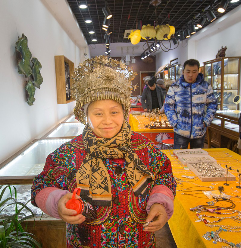 目前“苗奶奶”有12个员工,3个贵州人、9个西安人,店里的银饰大都是她和女儿设计的。杨玉芬不仅在凯里老家开办了银饰加工厂,还在西安招收徒弟叫他们现场做。她的女儿从北京城市学院珠宝设计专业毕业后,现在西安一家大商场租了专柜经营“苗奶奶”银饰。几年下来,“苗奶奶”在回民街名气大增,日进斗金,银饰还多次卖到美国、澳大利亚和欧洲各国。这些年,隔三差五出国去展卖“苗奶奶”银饰,对杨玉芬来说已成家常便饭,光是欧洲她就去了五六趟。