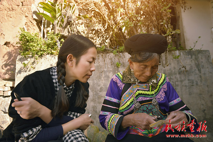 卢洁莹下乡向彝族老前辈请教彝绣图案样式(索玉文化美学创意有限公司 供图)
