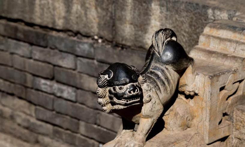 石雕“麒麟送子”也是对家族人丁兴旺的企盼。王家大院高家崖凝瑞居后院墙上的墙基石“麒麟送子”图,祥云瑞气缭绕着,捧出一条花草的道路,一只不吝雕工的麒麟活泼欢快地向前奔跑,他的身后是慈眉善目的老妪形象。头顶上还有一株大树,上刻两只小鸟,那就是“殷勤为探看”的青鸟吧,在这个时刻青鸟所关心的是小儿即将开始的人生旅程。