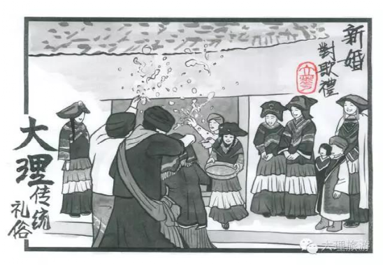 进新郎家时,新郎和新娘会对歌,新郎问新娘答,男女双方一问一答,对歌后,方能入门。