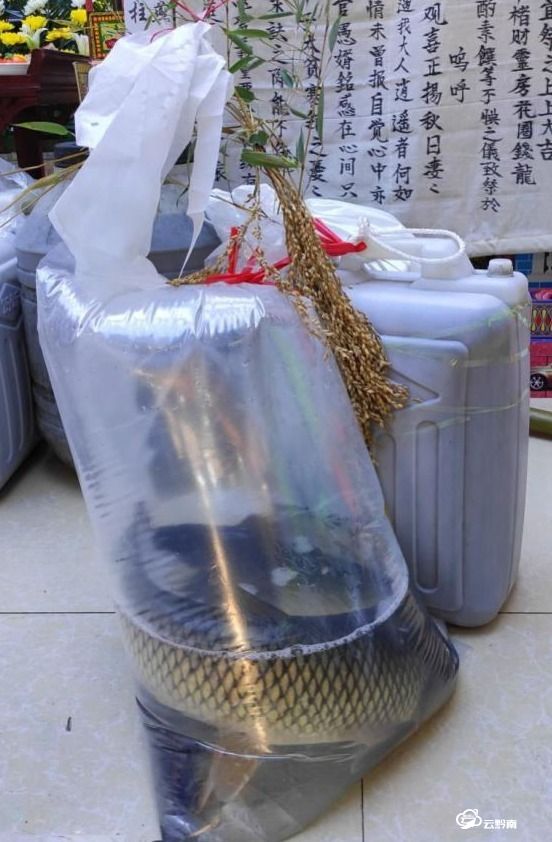 这幅图片拍摄于都匀殡仪馆,是在一位水族干部的葬礼上,三都水族自治县九阡镇的内侄们从家乡赶来凭吊姑父时,送来了三条大活鱼、一头小猪、一壶米酒等物。水族有忌荤不忌鱼的习俗,内侄送鱼表示与表兄弟姊妹一道忌荤,共同戴孝,共同守制;送来的小猪为堂祭牺牲,祭奠亡人。
