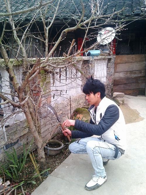 图为革家后生用柴刀在给果树“放血”,确保果树开花结果