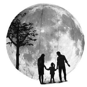 一家三口在景观月亮下留影,庆祝中秋佳节。董乃德摄