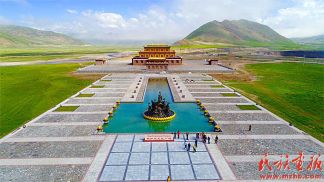 离德尔文村不远处,是气势恢宏的格萨尔文化广场。广场南端,耸立着格萨尔七勇士群雕像。广场北端,一座以藏式石木结构为主的建筑映入眼帘,这里是格萨尔文化艺术研究院。一层演艺区是向游客表演格萨尔史诗剧目的场所;二层是还原史诗重要场景的泥塑作品,每个史诗剧中的人物、马匹、牛羊都被制作得惟妙惟肖;三层的传颂馆也是文化传承基地。