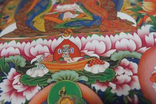 900多年前流传于卫藏地区(现山南)的齐乌岗派唐卡,由雅堆·齐乌岗巴创立,与嘎玛嘎赤画派、勉塘画派、钦孜画派、埃赤画派并称“唐卡五大画派”。齐乌岗派特点为人物体形饱满、生动细腻,色彩以枣红、橘红暖色系为主;中央的主尊突出,背景多用卷草纹作为装饰。特别是,齐乌岗派唐卡的佛像肩膀旁都有象征翅膀的“三角”,源于创始人齐乌岗巴行动灵敏,亦被称作“齐乌派”。