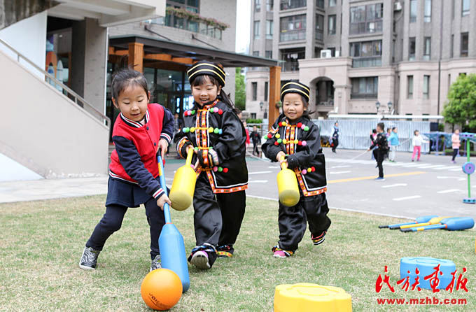 畲族的“摘柿子”、维吾尔族的“赛马”、黎族的“跳竹竿”、蒙古族的“射箭”……天恒名都幼儿园的操场上,孩子们正积极参加各种民族游戏活动,沉浸在无忧无虑的快乐中。4月13日,是上海市莘庄工业园区天恒名都幼儿园的“民族接力棒小社团”活动日,孩子们非常期盼这每周一次的活动日。