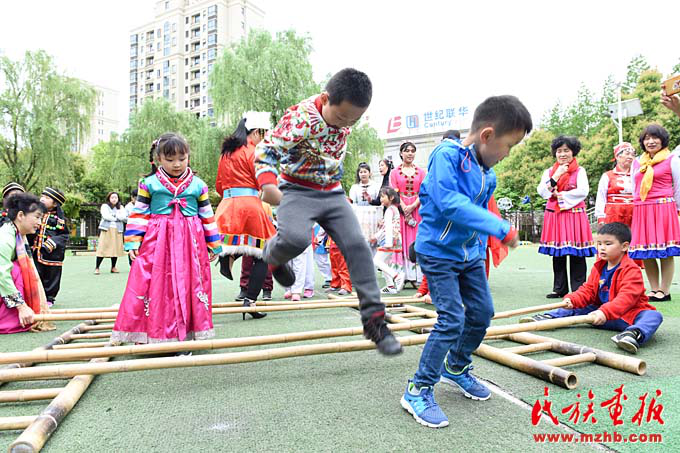 每次活动日,学校都会从民族传统游戏中梳理出十多个符合幼儿年龄特点、有助于幼儿身心发展的游戏内容,因地制宜转化成有趣的幼儿民间运动游戏。在游戏中,既让孩子们体验了运动乐趣,又传播了民族知识。这些富有童趣的游戏,深受孩子们喜爱。